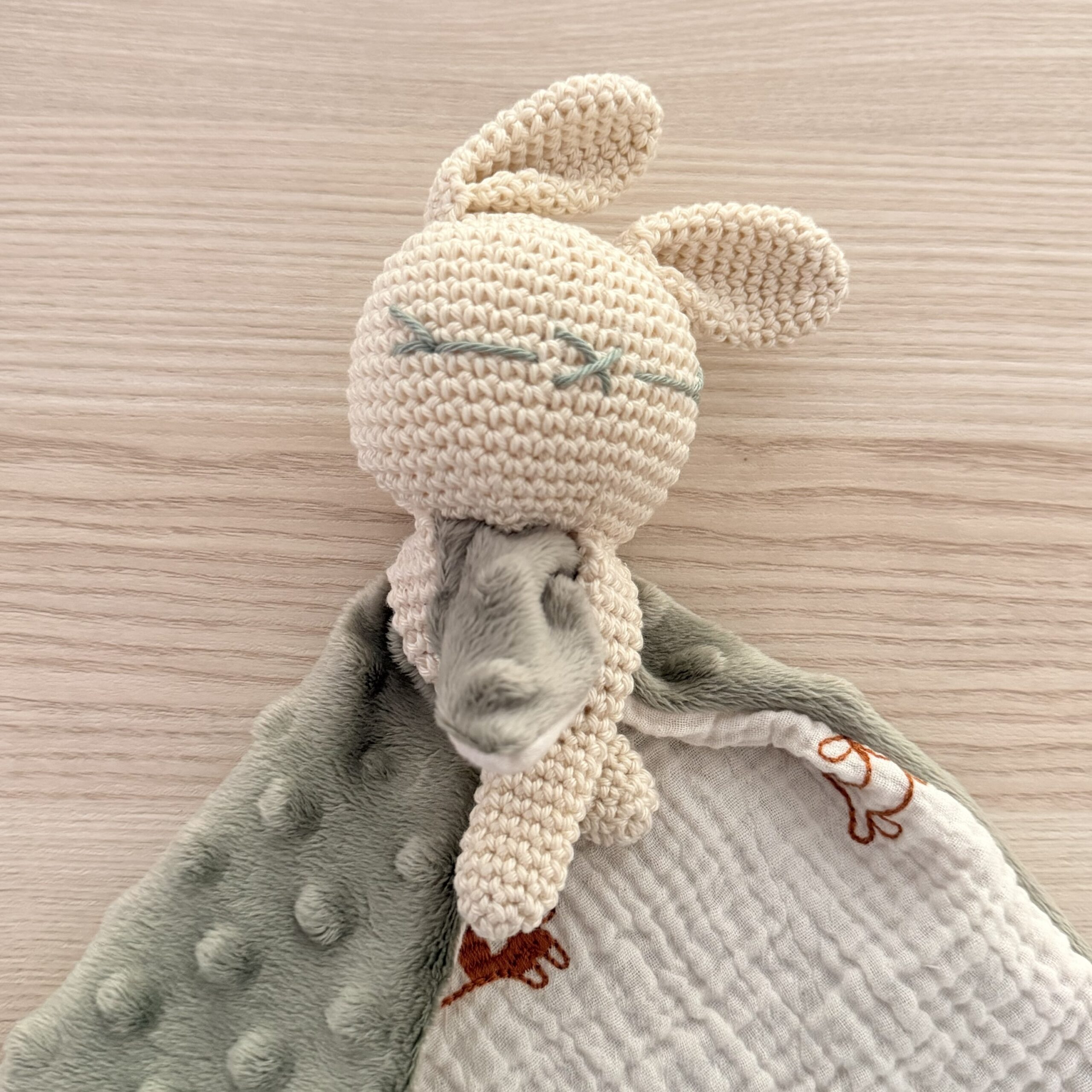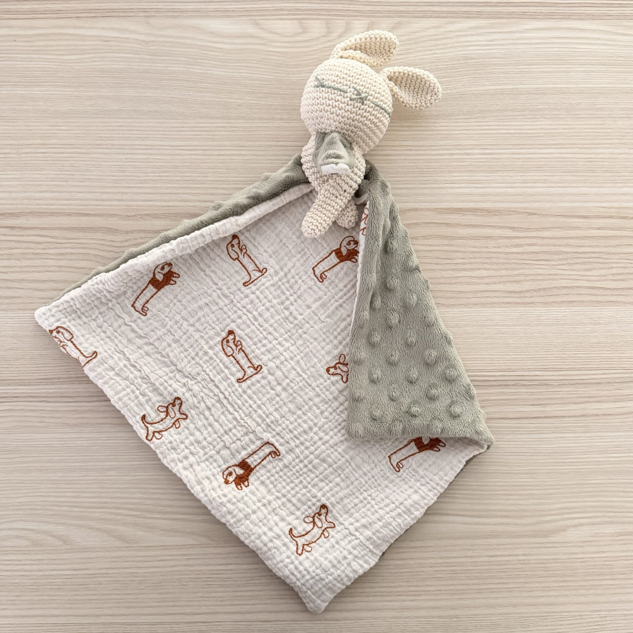 Ce magnifique doudou au crochet est accompagné d’un carré de tissu en milky et gaze de coton, parfait pour les petites mains curieuses et délicates.