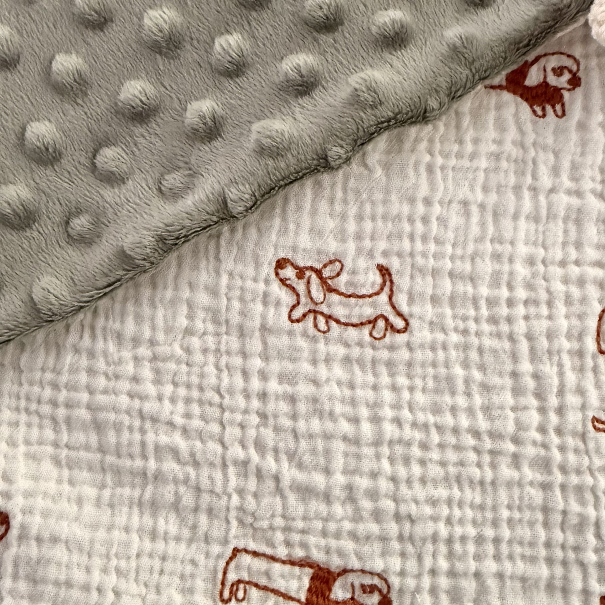 Couleur du doudou : vert/beige avec petit chien teckel.