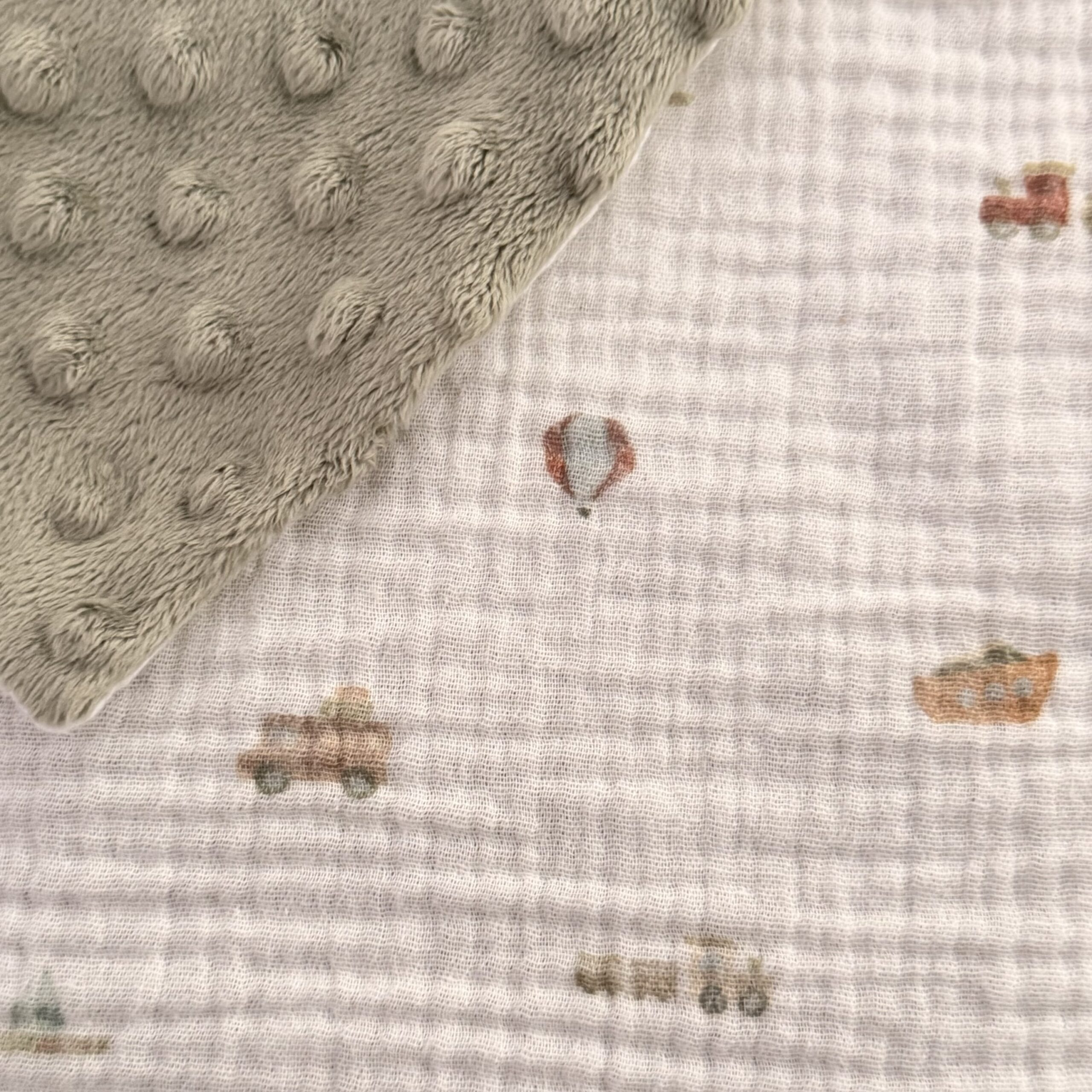 Couleur du doudou : vert/blanc avec petits tracteurs.
