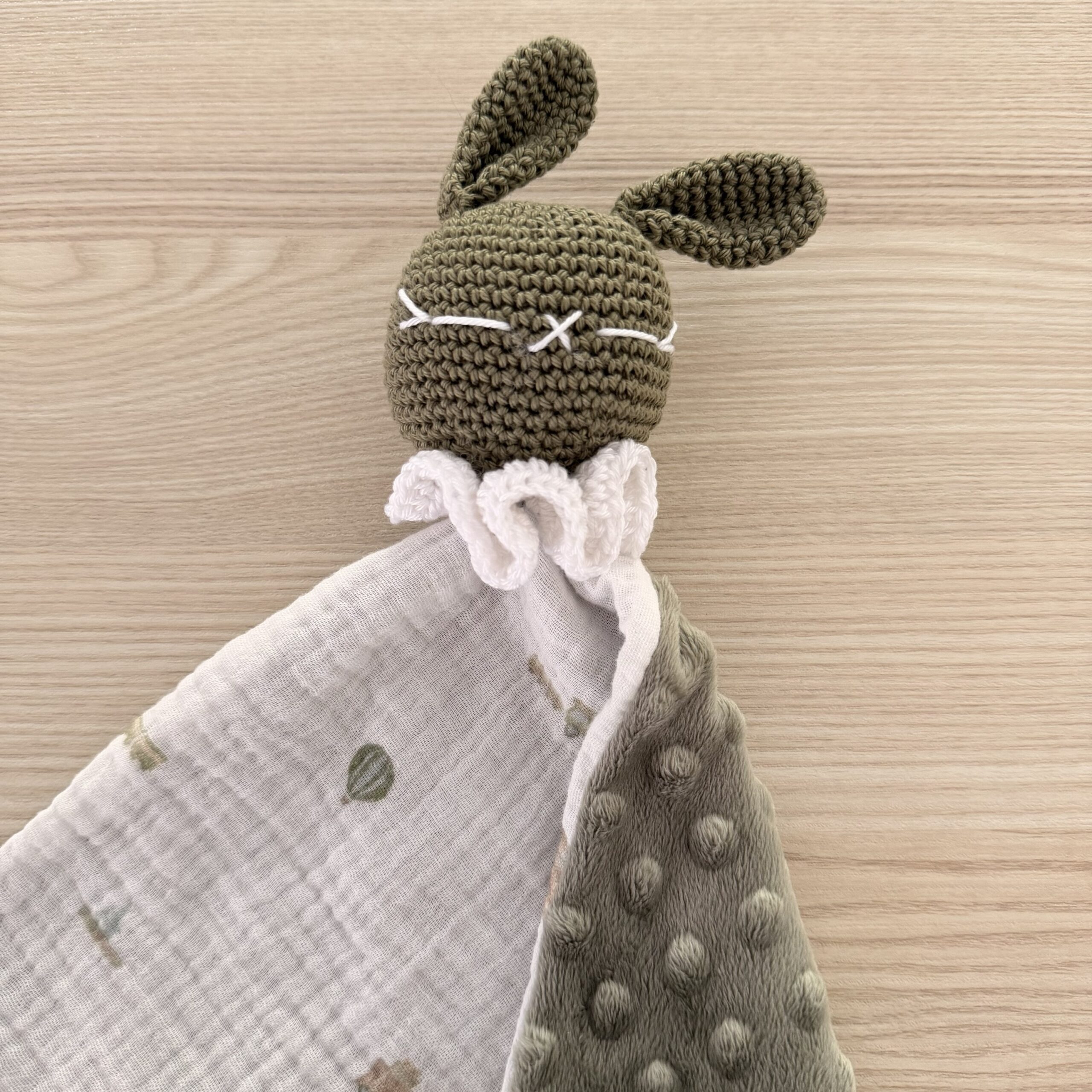 Ce magnifique doudou au crochet est accompagné d’un carré de tissu en milky et gaze de coton, parfait pour les petites mains curieuses et délicates.