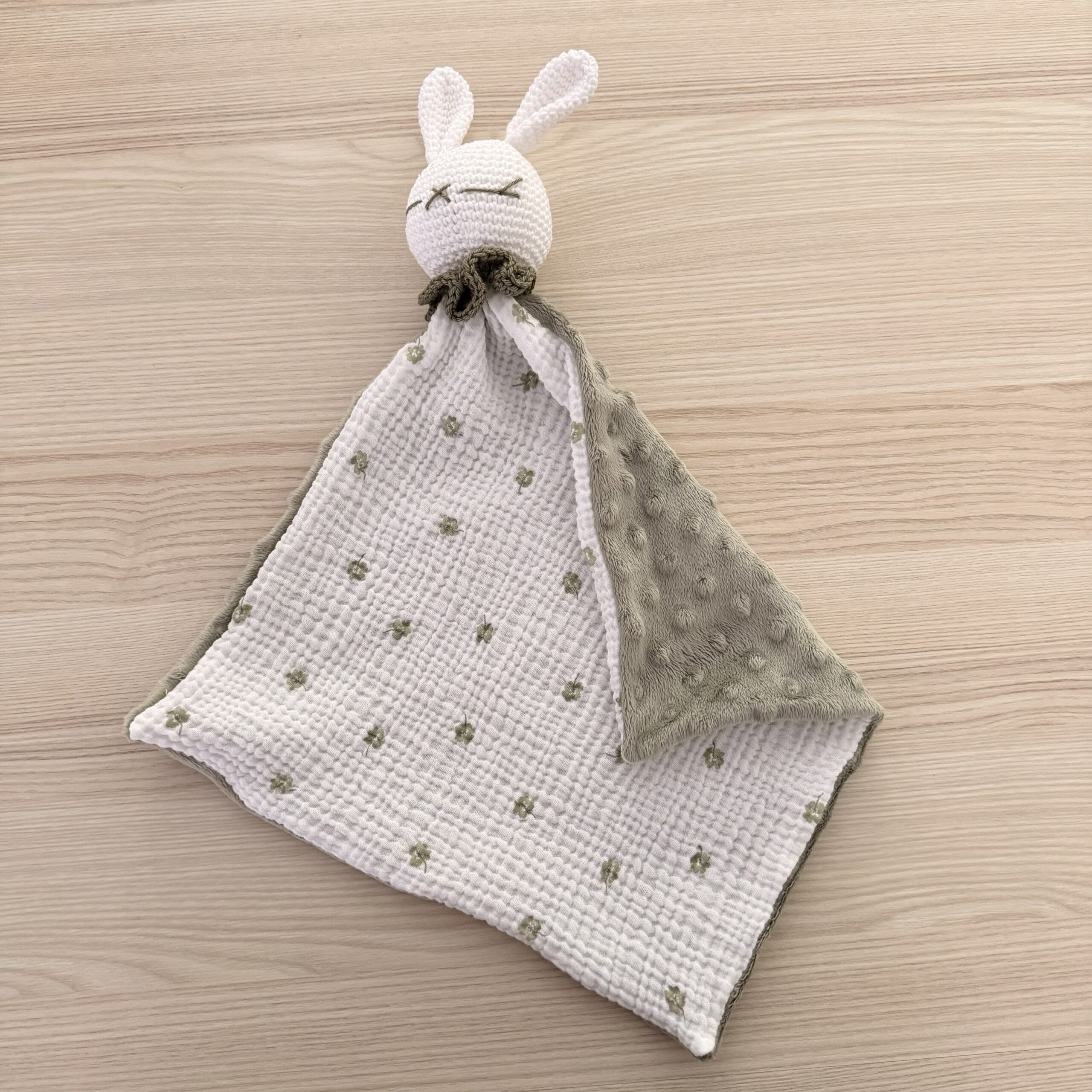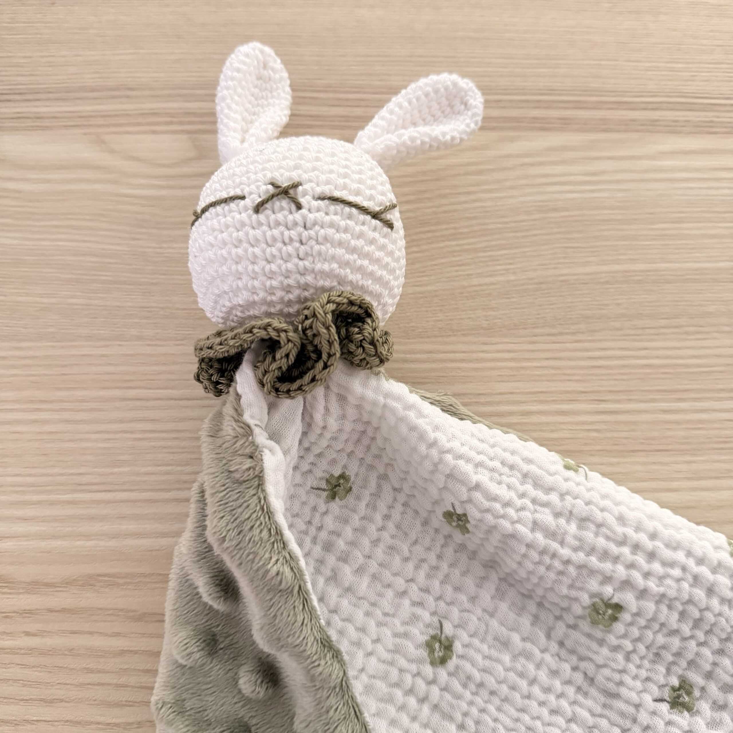 Ce magnifique doudou au crochet est accompagné d’un carré de tissu en milky et gaze de coton, parfait pour les petites mains curieuses et délicates.